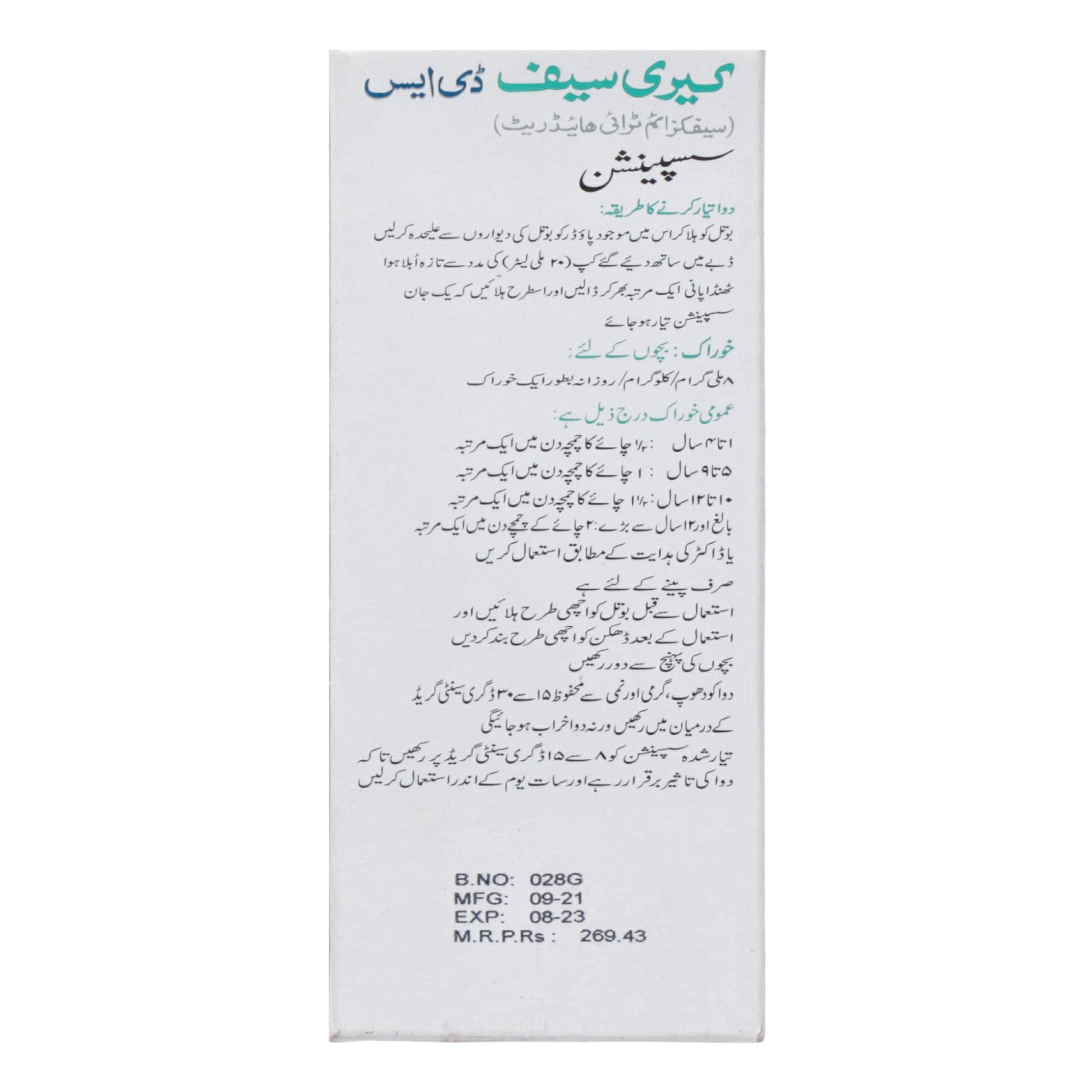 Storage: Replace cap securely after use. Keep out of reach of children Avoid exposure to heat, light and humidity. Store between 15 to 30C. Improper storage may deteriorate the medicine. The reconstituted suspension should be kept at 8-15C, so that potency of the product remains stable and be used within 7 days.