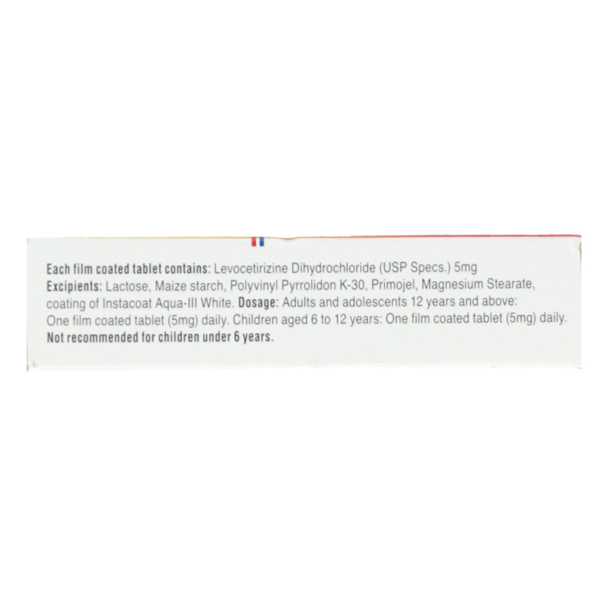 Ingredients: Composition: each film coated Tablet contains: levocetirizine dihydrochloride usp specs - 5mg